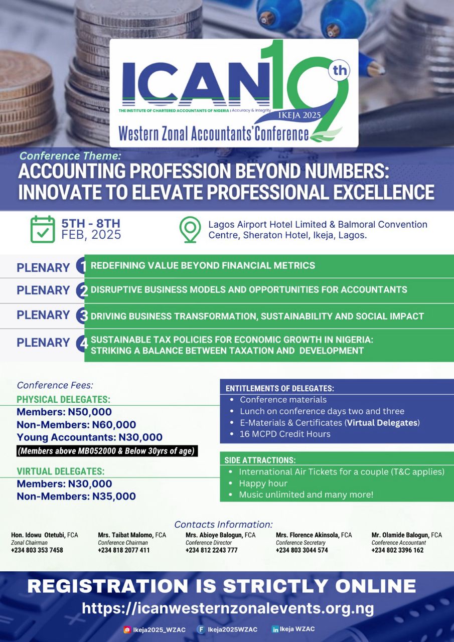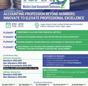 Step up your game in conference participation from your comfort zone to the learning zone, from the learning zone to the gaining zone Let's learn the new tricks of Accounting beyond Numbers for our economic emancipation Register here - https://icanwesternzonalevents.org.ng/ Let's get prepared for the 19th Western Zonal Accountants' Conference tagged Ikeja 2025 with the theme: Accounting Profession Beyond Numbers: Innovate to Elevate Professional Excellence between 5th-8th February 2025 @ Balmoral Event Centre by Sheraton Ikeja. Kindly Log on to icanwesternzonalevents.org.ng to be part of this landmark event and secure your qualitative 16 MCPD credit hours—a professional boost that’s simply too good to resist! The West’s top conference is coming your way. We are working round the clock to change the narratives for the good of the conference delegates. Watch out for Ikeja 2025! (C) 19th WZAC Publicity Committee